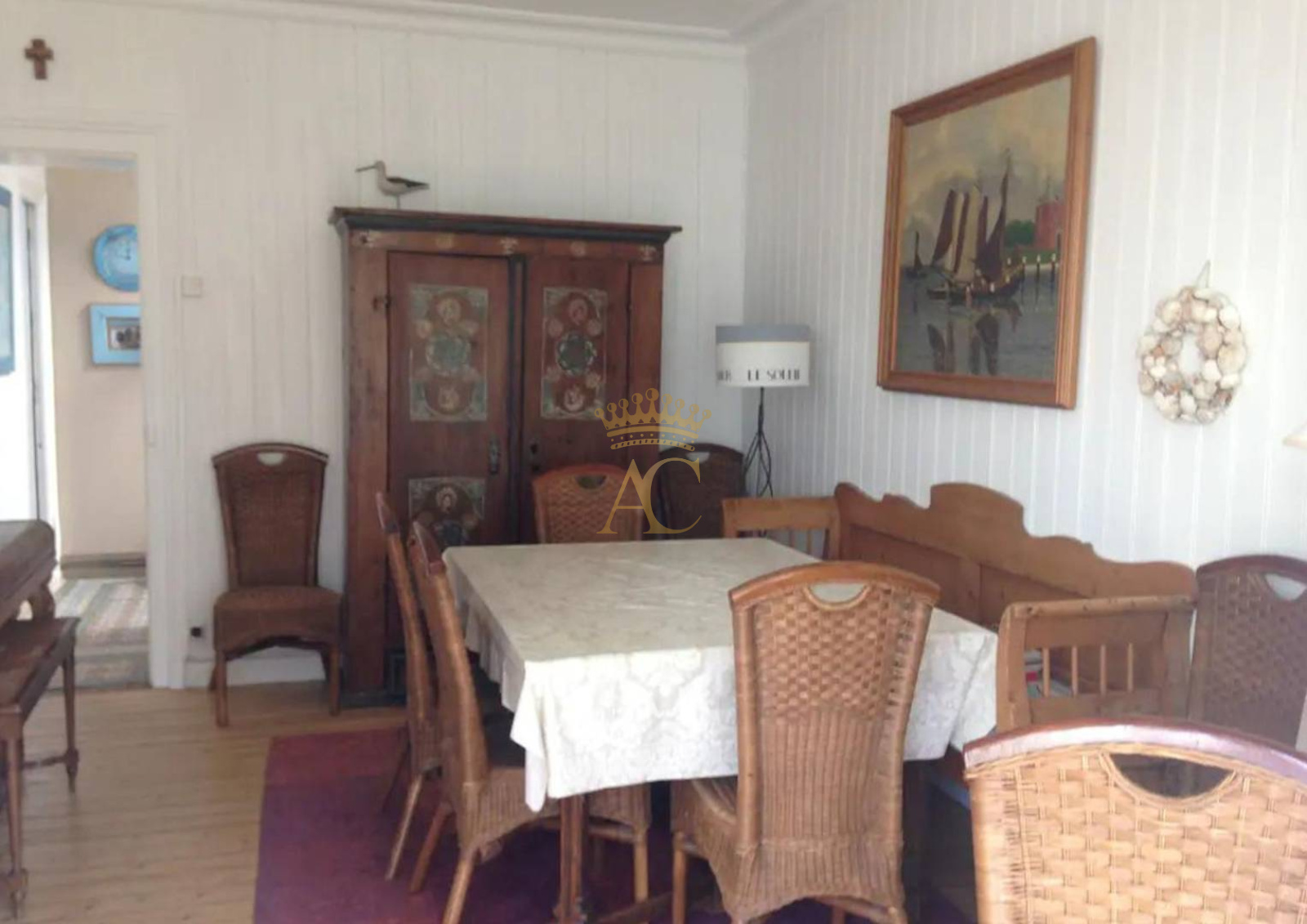 La cuisine, adjacente au séjour, est spacieuse et entièrement équipée avec des appareils modernes et des ustensiles de cuisine de qualité. Une grande table à manger occupe le centre du séjour, idéale pour les repas conviviaux.