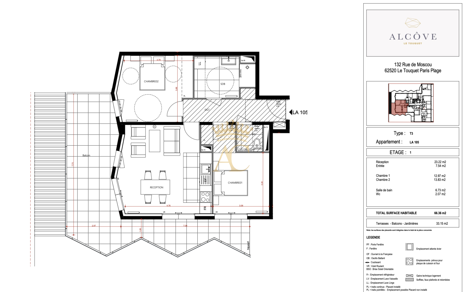 Le Touquet-Paris-Plage (62520)Acquisition de ce grand T3 dans la commune du Touquet-Paris-Plage. Dans un programme immobilier neuf de qualité prévu pour 2026. Si vous voulez plus d'informations ou avez besoin d'aide dans votre recherche de logement, votre agence immobilière Agence Centrale se fera un plaisir de vous aider. L'intérieur mesure 66.36m² et comporte 2 chambres, un coin salon de 23m², une salle d'eau et un espace cuisine. L'appartement donne accès à un espace de stockage en sous-sol. La tranquillité des occupants est garantie grâce aux fenêtres à double vitrage. Consomme peu d'énergie, satisfaisant aux critères du label BBC. Dehors, le logement s'accompagne d'un balcon de 33.15m², ce qui porte la superficie exploitable à 99.51m². Il s'agit d'un bien au 1er étage d'un bâtiment sur 4 niveaux ; un ascenseur est présent à l'intérieur de l'immeuble. Il donne accès à un garage privatif qui garantit la sécurité de votre véhicule. Prix minimum : 789 500 €.