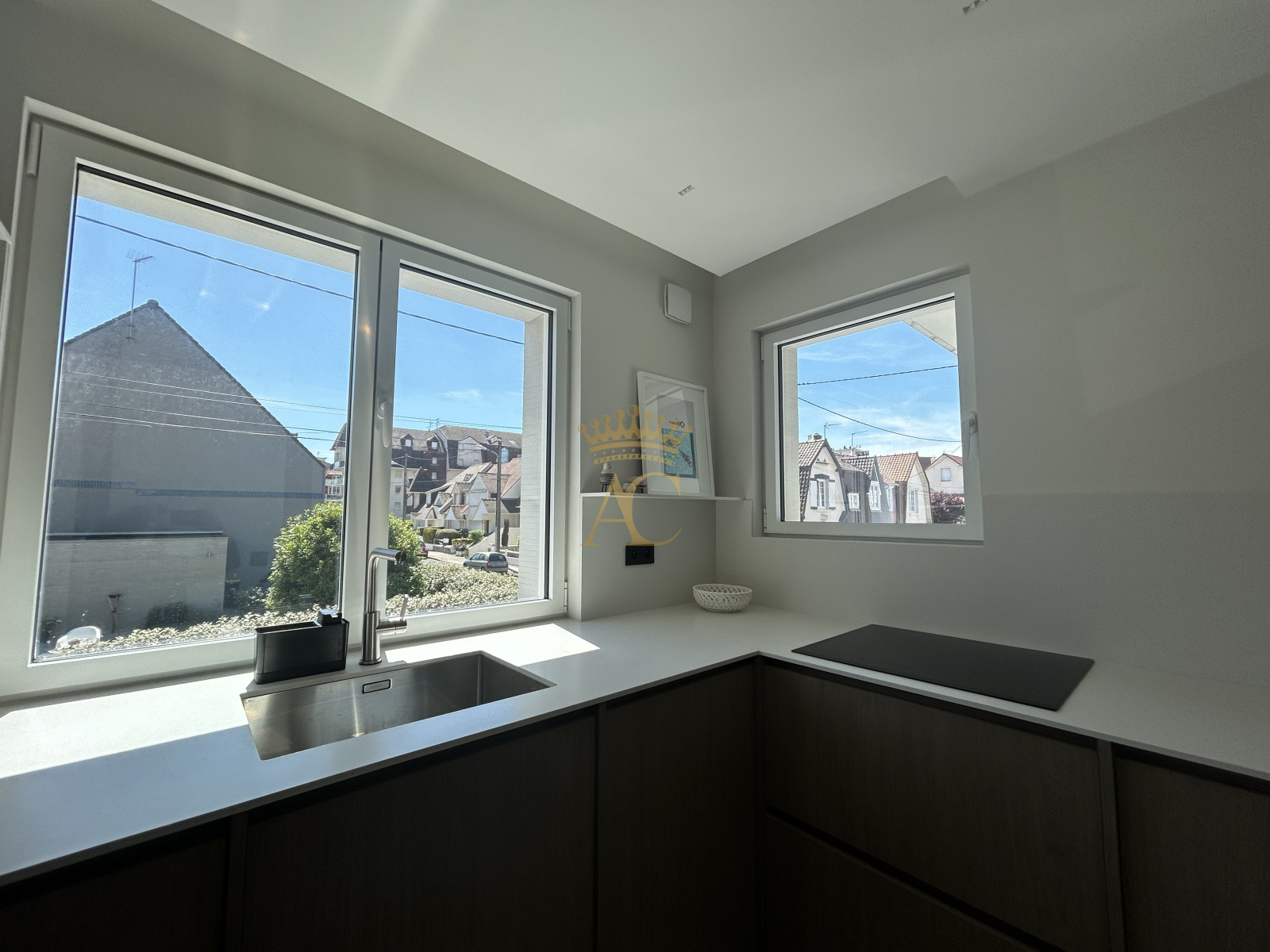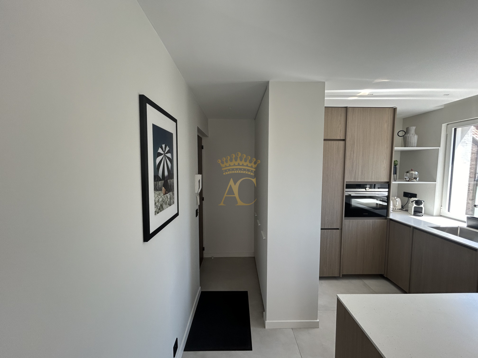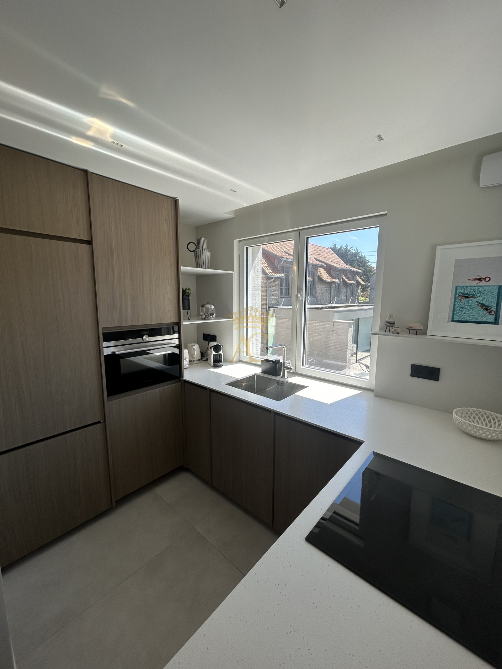 - **Cuisine sur mesure** : Réalisée par un menuisier expert, équipée d'un plan de travail en corian, combinant élégance et fonctionnalité.