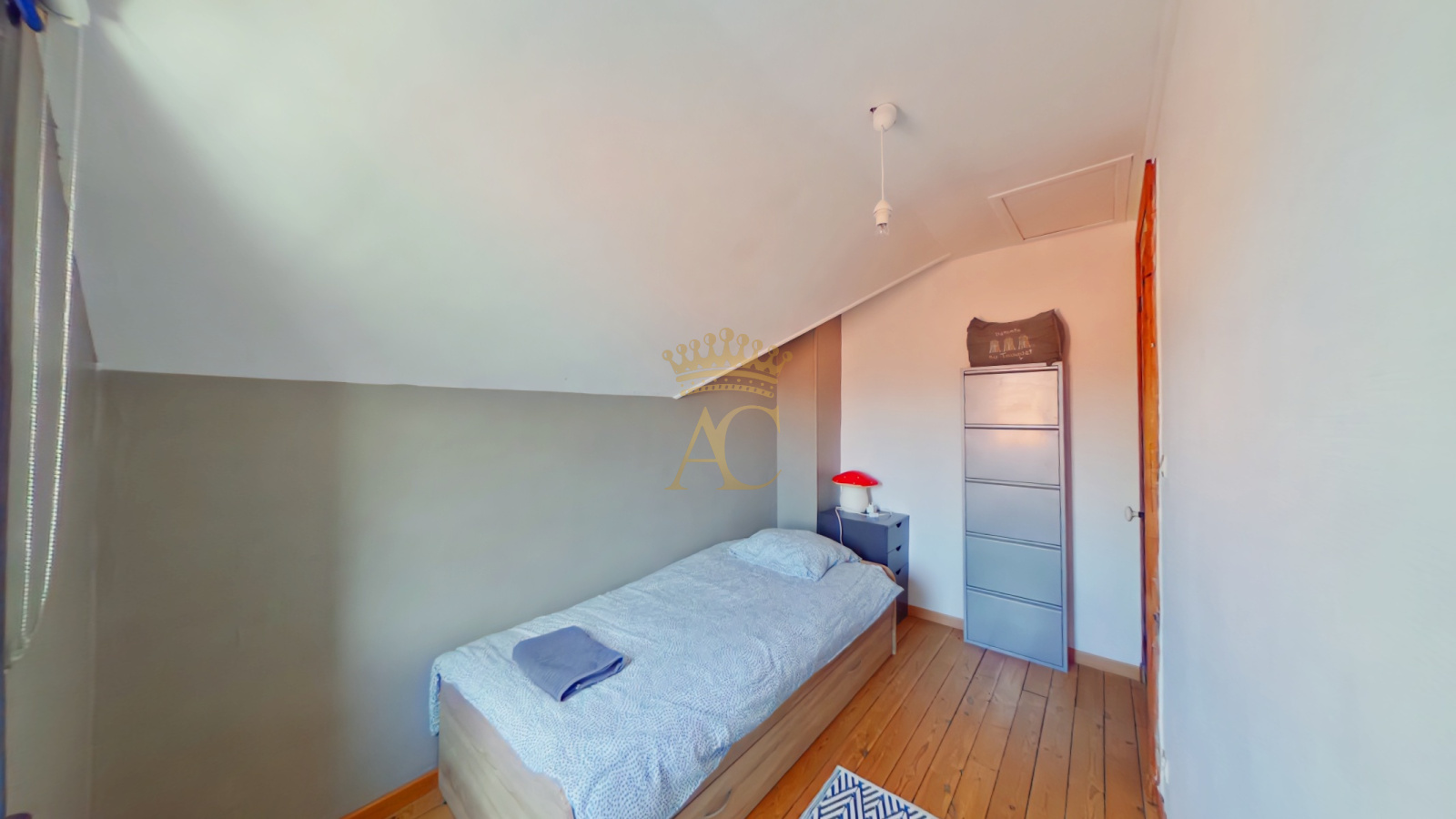 - 1er étage : chambre avec balcon et placards, salle d’eau avec WC