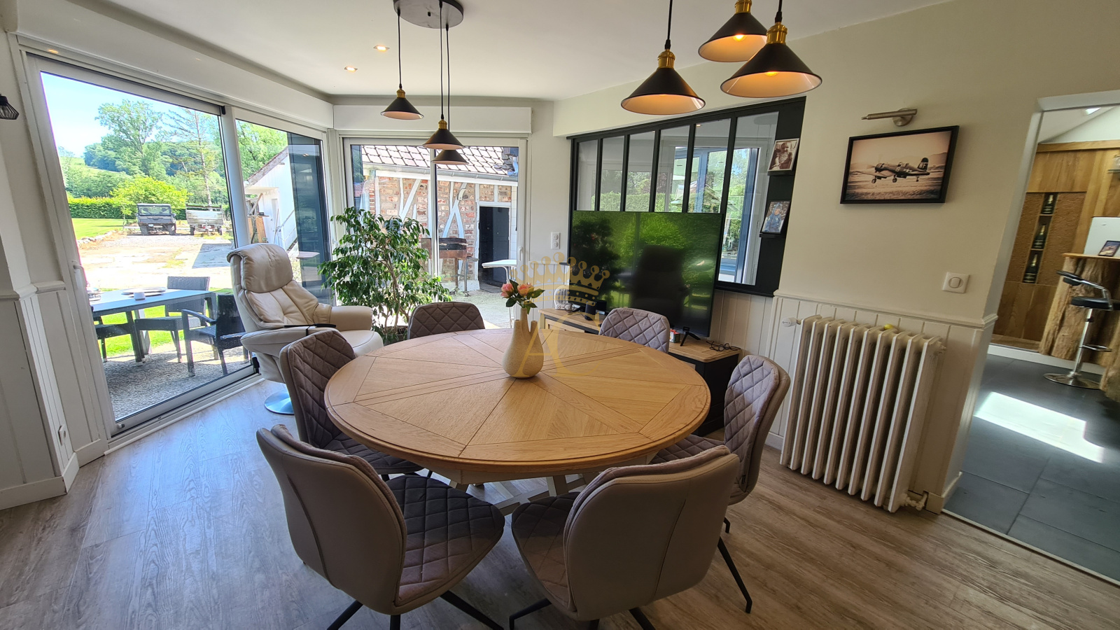 Une entrée avec placard dessert un séjour de 35 m², un salon de 15 m², une salle à manger donnant sur une terrasse sud-est, un espace bar, ainsi qu'une grande cuisine de 27 m² entièrement équipée (hotte Novy, plaque 6 feux, gril intégré, îlot central), pensée pour les passionnés de cuisine. On retrouve également une salle de bains, un WC indépendant, une buanderie et une chaufferie. Il est possible d'y créer une chambre supplèmentaire de plain-pied avec vue sur le jardin, sans gros travaux.